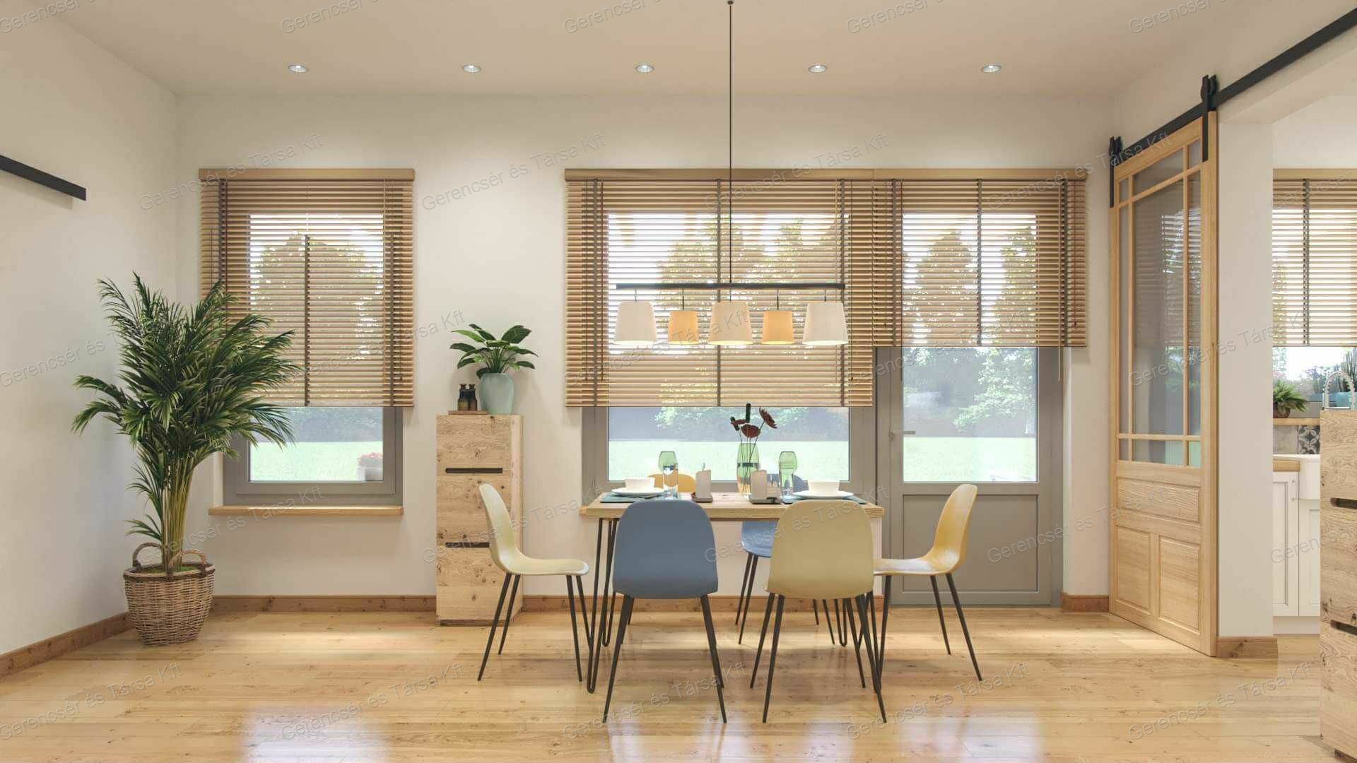A 98 m²-es, modern elrendezésű otthon helyiségei: